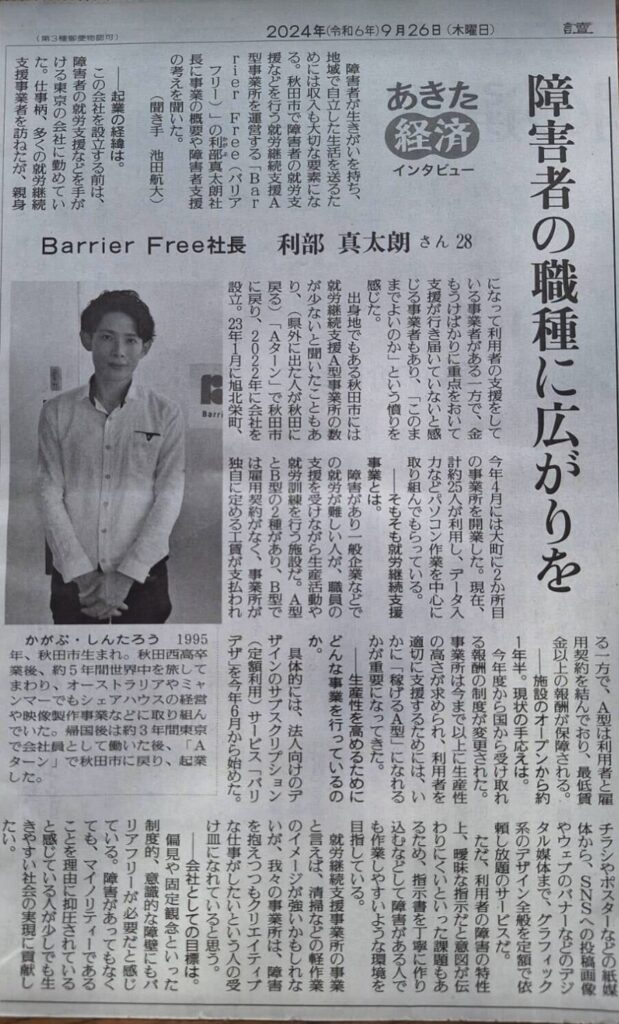 弊社代表の利部が9月26日の読売新聞・あきた経済インタビュー枠で掲載されました。